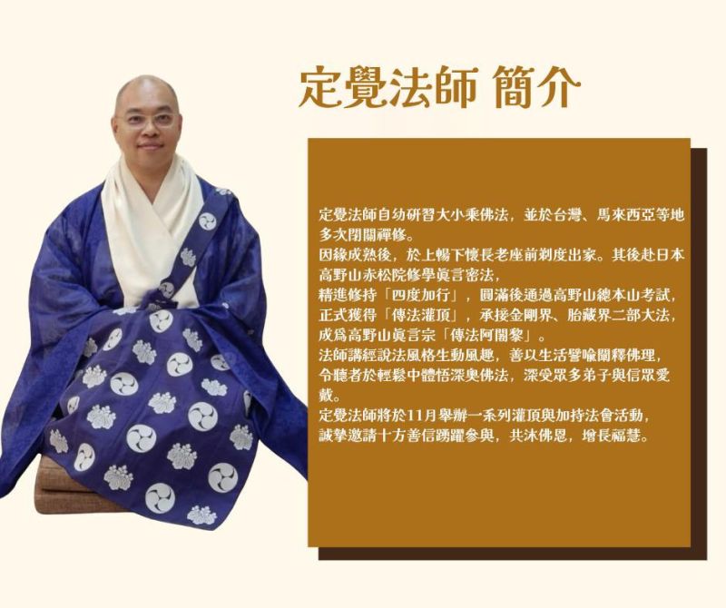 定覺法師承接日本高野山「傳法阿闍黎」的完整傳承,講經說法生動風趣,善以生活譬喻闡釋深奧佛理,深受廣大信眾愛戴。